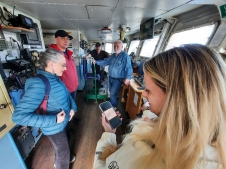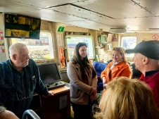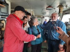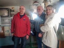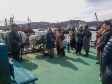 The excursion for the class teachers was conducted by the Deputy Director for Science of MMBI RAS, Chairman of the Murmansk Regional Branch of the Russian Geographical Society, Ph.D. (Geography) Denis Moiseev, and members of the "Dalnie Zelenets" crew – the ship's captain N.I. Morozov, the third mate Yu.F. Rotar, and sailor L.I. Gritsunik. The teachers were introduced to the daily life of the ship's crew, told how water rescue equipment works, and shown its storage location on the deck. The visitors also learned how the crew members interact during voyages and how duties are distributed among them. Denis Moiseev told the guests of the "Dalnie Zelenets" about the types of specialists who work on the ship and explained the layout of the premises where research work is organized during scientific voyages.