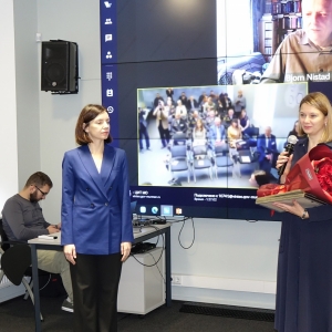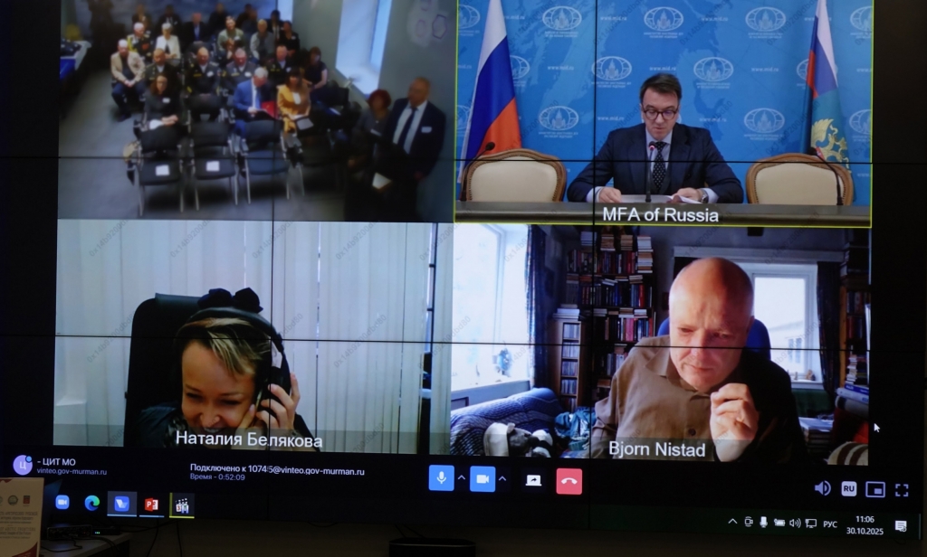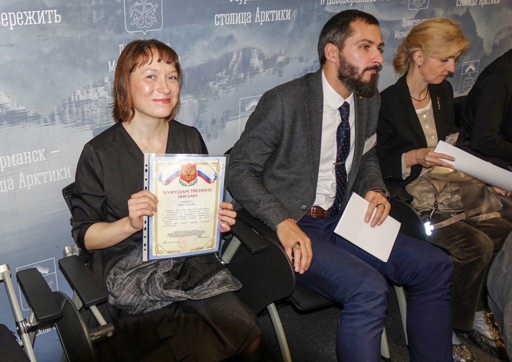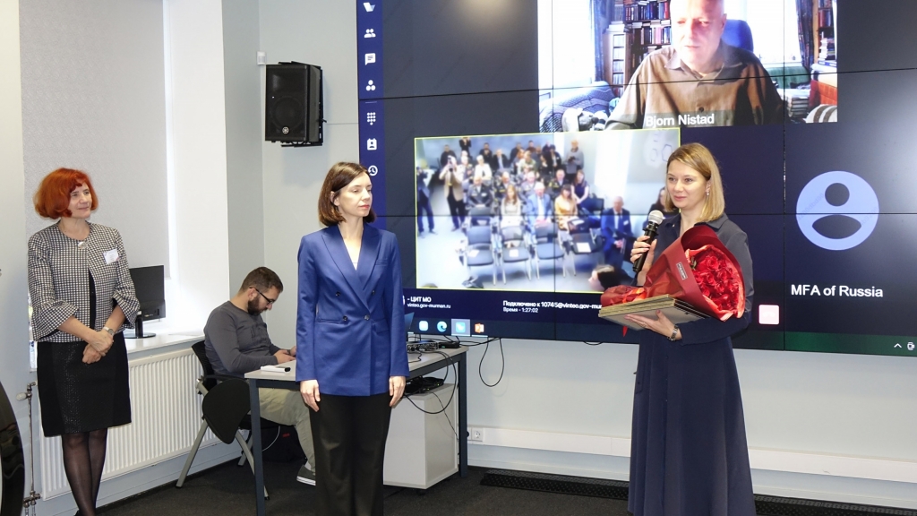 30 октября в Центре управления регионом состоялась секция «Вопросы мира, безопасности и устойчивого развития Арктики». Участников приветствовали директор Департамента общеевропейского сотрудничества МИД России Владислав Масленников, директор департамента экспедиций и туризма РГО Наталия Белякова и министр развития Арктики Светлана Панфилова. Наталия Белякова анонсировала открытие Экспедиционно-туристического центра РГО в норвежском Баренцбурге на Шпицбергене, отметив, что это продолжает стратегию постоянного научного присутствия России в высоких широтах. В рамках секции прошла церемония награждения: Благодарственным письмом Губернатора Мурманской области была отмечена член РГО Ирина Мхитарян за вклад в сохранение военно-исторического наследия на острове Кильдин.