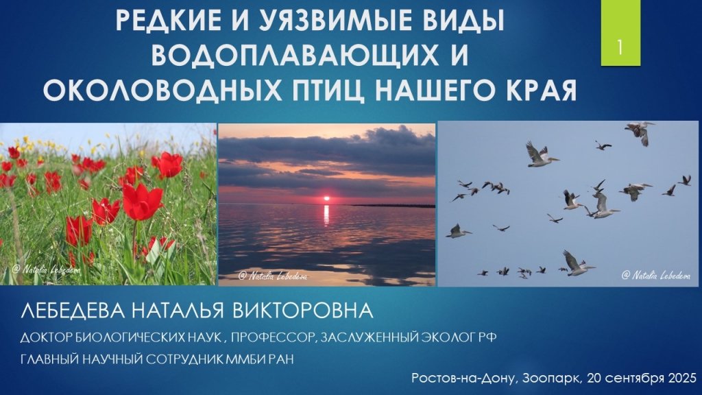 20 сентября в День города Ростова-на-Дону в рамках мероприятий Русского географического общества главный научный сотрудник лаборатории орнитологии и паразитологии ММБИ профессор Наталья Лебедева прочитала лекцию для юннатов в Ростовском зоопарке на тему «Редкие и уязвимые виды водоплавающих и околоводных птиц нашего края». В лекции приняли участие 30 юннатов. Юннаты активно общались и задавали вопросы. По результатам лекции слушателям были даны задания и вопросы: как отличить пискульку в стае гусей, различать кудрявого и розового пеликана, находить различия у самок кряквы и серой утки. Все ребята успешно справились с заданиями.