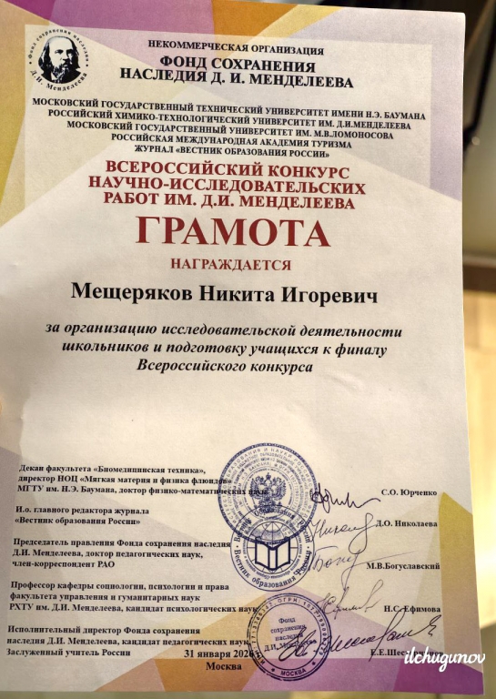 Мурманский школьник Максим Чугунов одержал победу на Всероссийском конкурсе научно-исследовательских работ имени Д.И. Менделеева. Конкурс, организованный Фондом сохранения наследия великого русского учёного, ставит своей целью поддержку талантливых молодых исследователей и развитие интереса к научной деятельности.