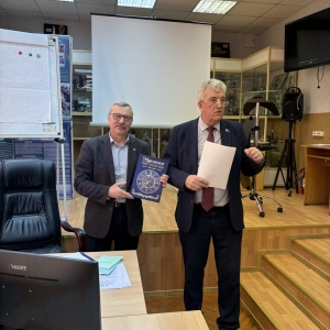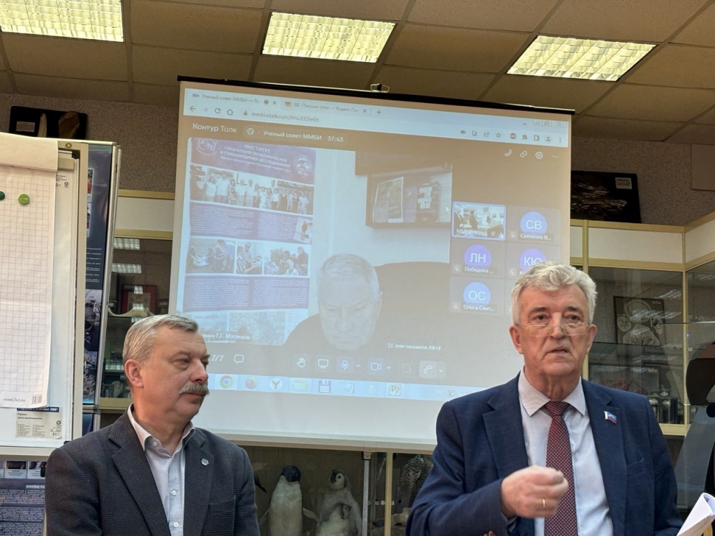 В качестве почётного гостя и давнего друга ММБИ на заседании присутствовал заместитель председателя Мурманской областной Думы Геннадий Степахно. Он представил доклад о перспективах развития биотехнологий в Мурманской области. Геннадий Васильевич в своём выступлении подчеркнул важность научных исследований и технологического развития для региона, отметив необходимость возвращения лидерства в этой сфере Кольскому Заполярью. Мурманская область обладает значительным потенциалом для развития биотехнологий – здесь есть богатые морские и гидробиологические ресурсы, развитый агропромышленный комплекс и, что особенно важно, высококвалифицированные научные кадры. Он обратил внимание на активную работу учёных ММБИ, в частности научно-исследовательской группы Екатерины Облучинской, по разработке технологий переработки морских ресурсов и созданию биологических продуктов функционального и специализированного значения.