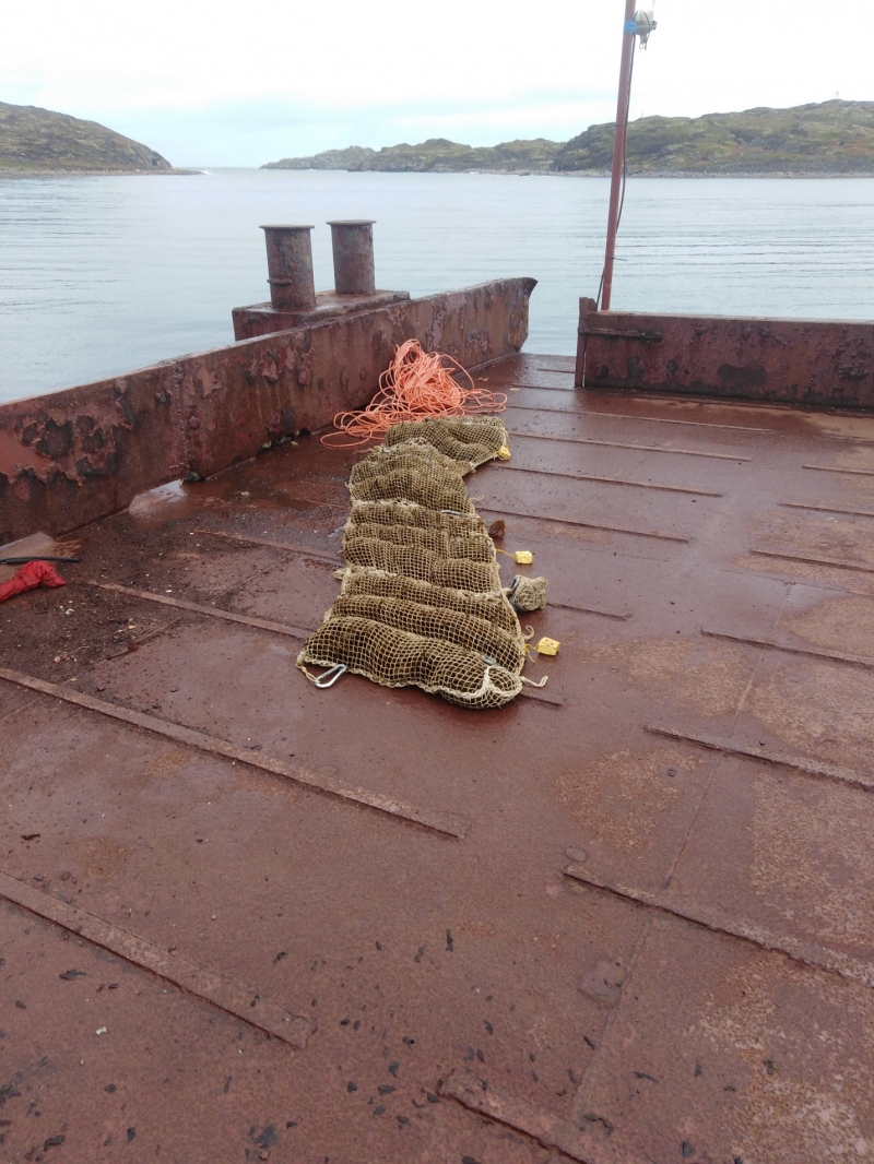 Биомат с водорослями перед установкой на дне около причала в губе Зеленецкой