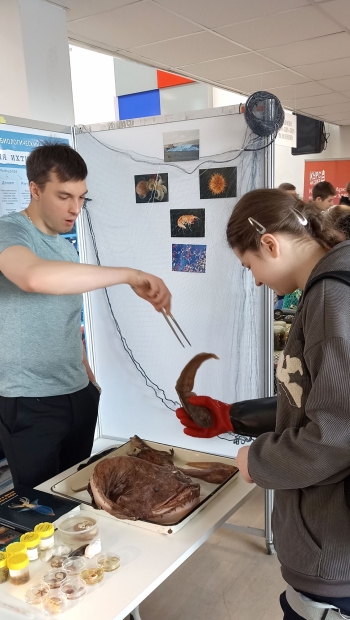 At the MMBI career guidance station, led by research scientists Alyona Noskovich, Oleg Bondarev, Dmitry Pugovkin, and Dmitry Salakhov, young northerners could examine under a microscope and touch samples of Arctic algae, benthos, and fish. The anglerfish was, as always, irresistible and very popular with both children and adults. We hope that the scientific mysteries of our northern seas deapths genuinely interested the forum visitors, and we will one day see them among our young colleagues!