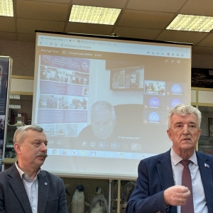 В качестве почётного гостя и давнего друга ММБИ на заседании присутствовал заместитель председателя Мурманской областной Думы Геннадий Степахно. Он представил доклад о перспективах развития биотехнологий в Мурманской области. Геннадий Васильевич в своём выступлении подчеркнул важность научных исследований и технологического развития для региона, отметив необходимость возвращения лидерства в этой сфере Кольскому Заполярью. Мурманская область обладает значительным потенциалом для развития биотехнологий – здесь есть богатые морские и гидробиологические ресурсы, развитый агропромышленный комплекс и, что особенно важно, высококвалифицированные научные кадры. Он обратил внимание на активную работу учёных ММБИ, в частности научно-исследовательской группы Екатерины Облучинской, по разработке технологий переработки морских ресурсов и созданию биологических продуктов функционального и специализированного значения.