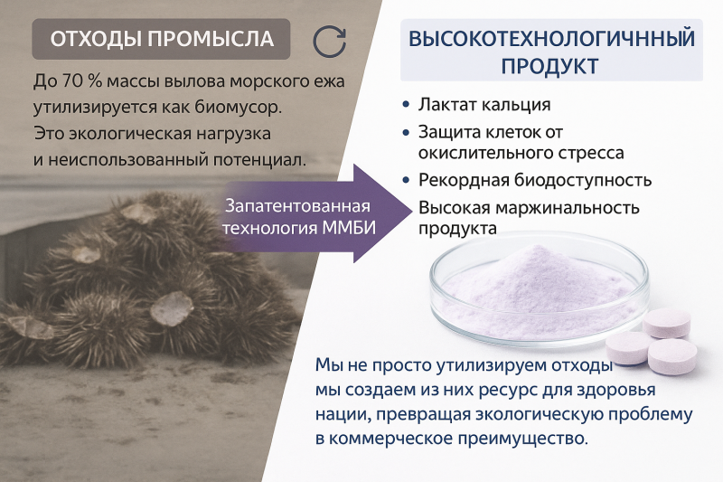 Ученые научно-исследовательской группы биохимии и технологии гидробиотнов ММБИ РАН ( к.фарм. О.Н. Пожарицкая, д.фарм.н. Е.Д. Облучинская и д.фарм.н. А.Н. Шиков) запатентовали технологию получения органической соли кальция из панцирей северных морских ежей Strongylocentrotus droebachiensis. Это решение закрывает сразу две глобальные проблемы: дефицит кальция у населения и экологичную утилизацию отходов морского промысла.